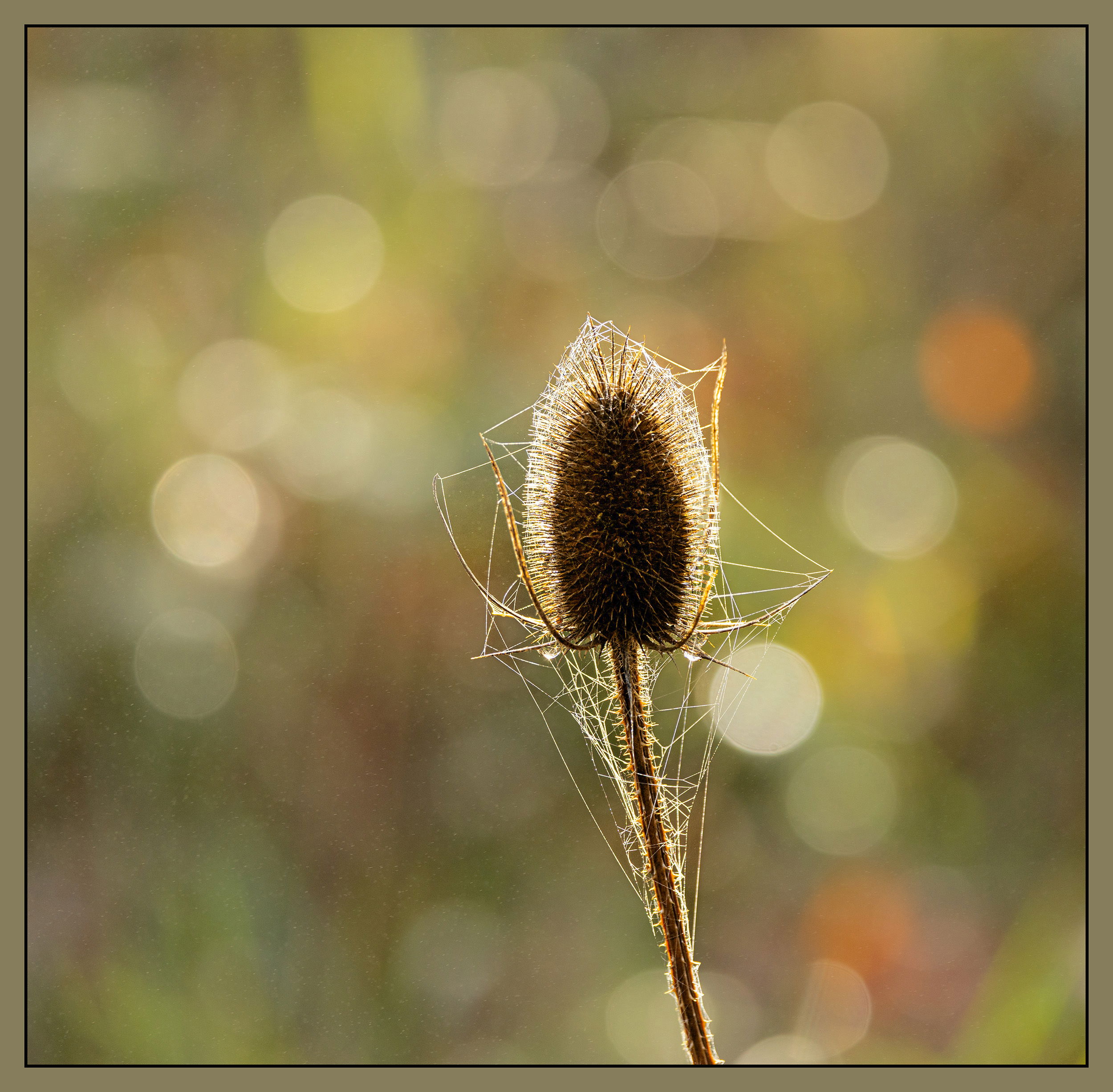 Fine image of a well-seen subject. The bokeh is a terrific contrast to the sharply textured teasel, which is itself a wonderful contrast to the web.