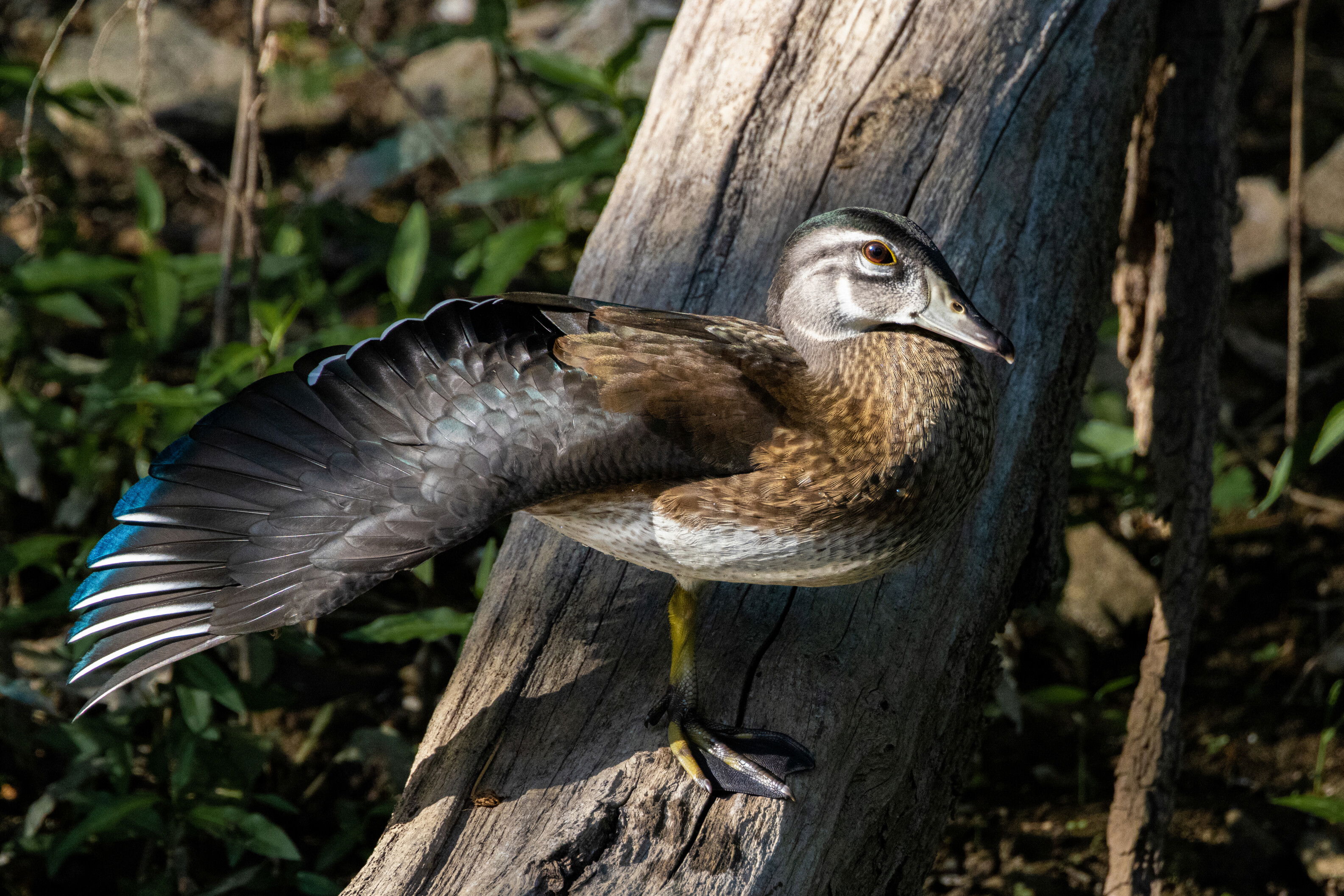 I enjoyed the colors displayed by this young wood duck stretching its wing