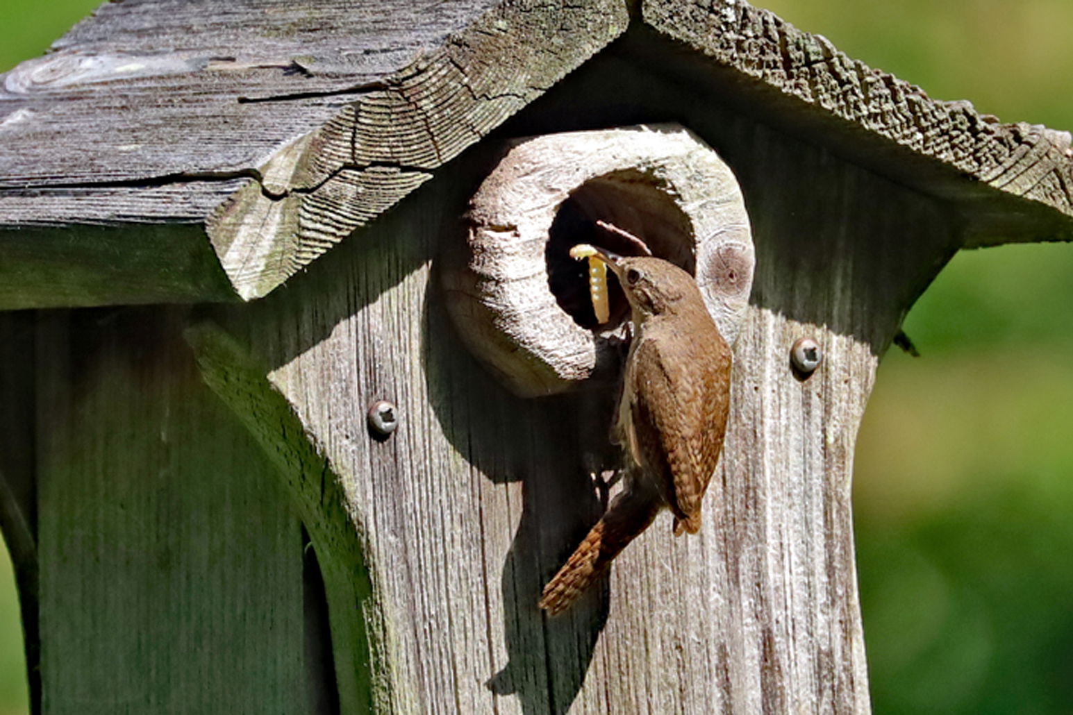1/3200 @ F-8, ISO 3200.  Was set at auto ISO, shutter speed by mistake.  Tripod.  Was about 20 feet from nest box.  Even though these wrens at use this site for years and were use to people, I did not want to move closer.  Also, was able to stay in the shade on a 90+degree day.