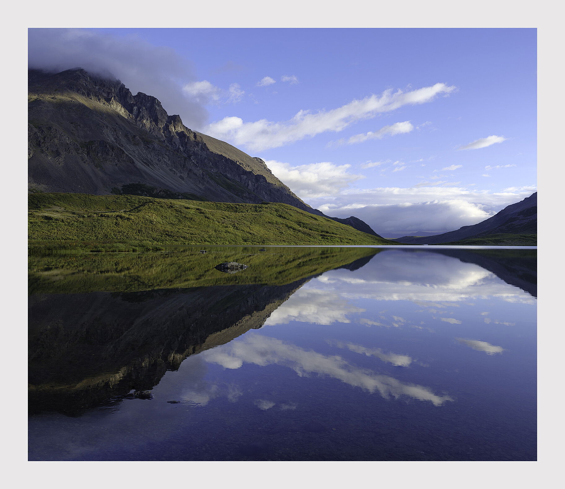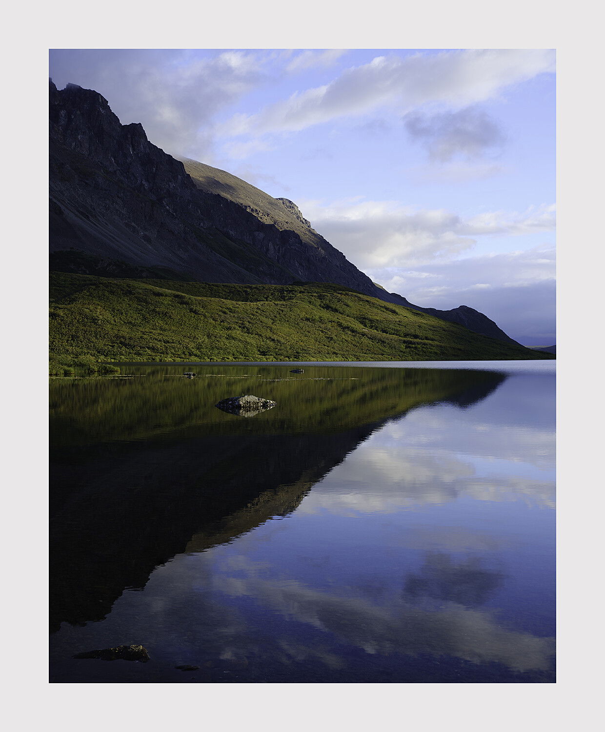 So many enjoyable elements that keeps me engaged and want to explore more; Terrific clouds + their reflection, the light striking both the grassy shore (and reflection) and the very nice strip of light near the mountain tops, the distant low-hangling clouds and then the rock then Ben points out, the strip of the lakes surface on the far side… just everything about this.