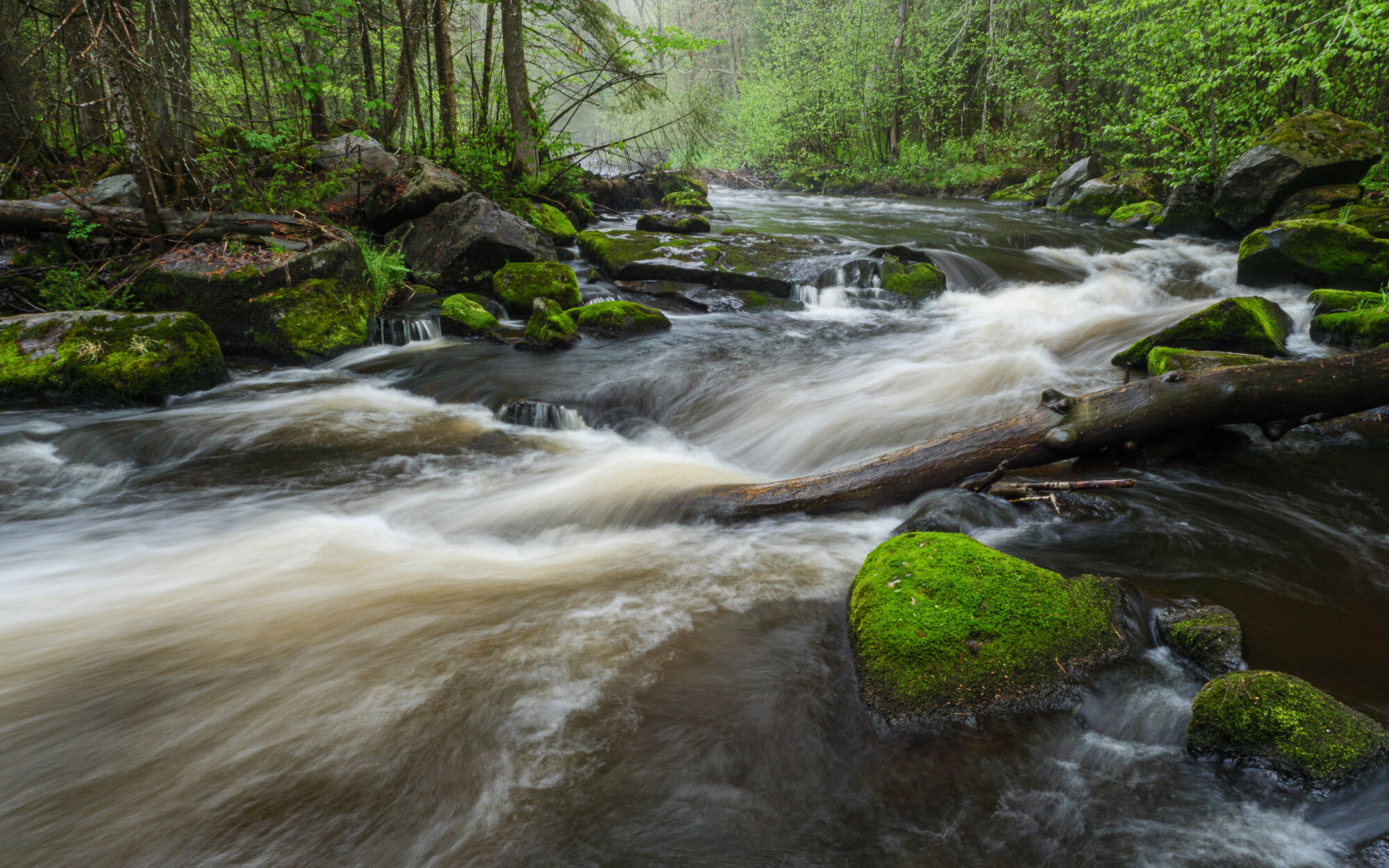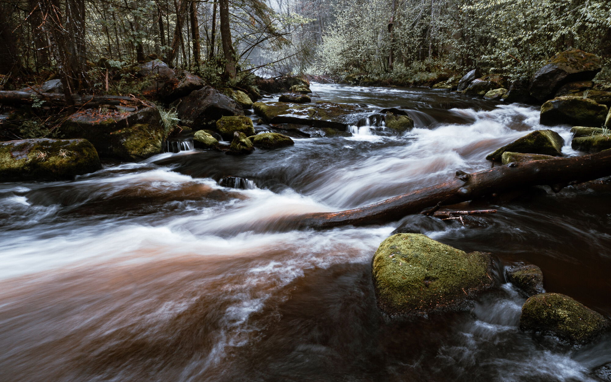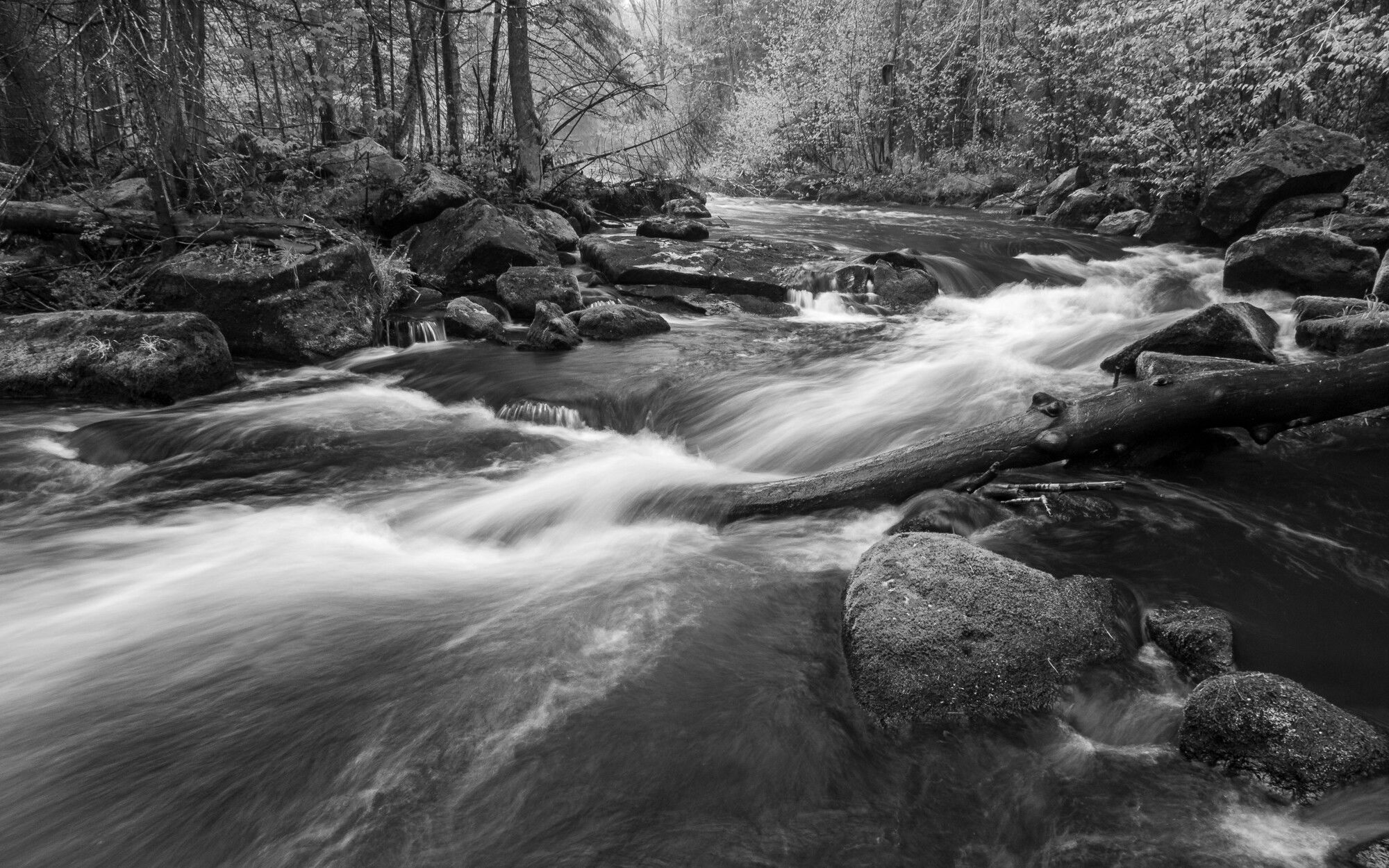 This is like those choices you have to make for a profile in Adobe Raw. I can never decide. I was all set to pick the first one due to the wonderfully colored moss on the major rock. Then I looked at the images on a larger screen and I may prefer the second. Naw, it’s the first. The blacks are a bit too dominant in the second image. And yes, it’s the moss on the rock that makes the first image. Great composition. There’s a lot of energy from the diagonals that go with the moving water.