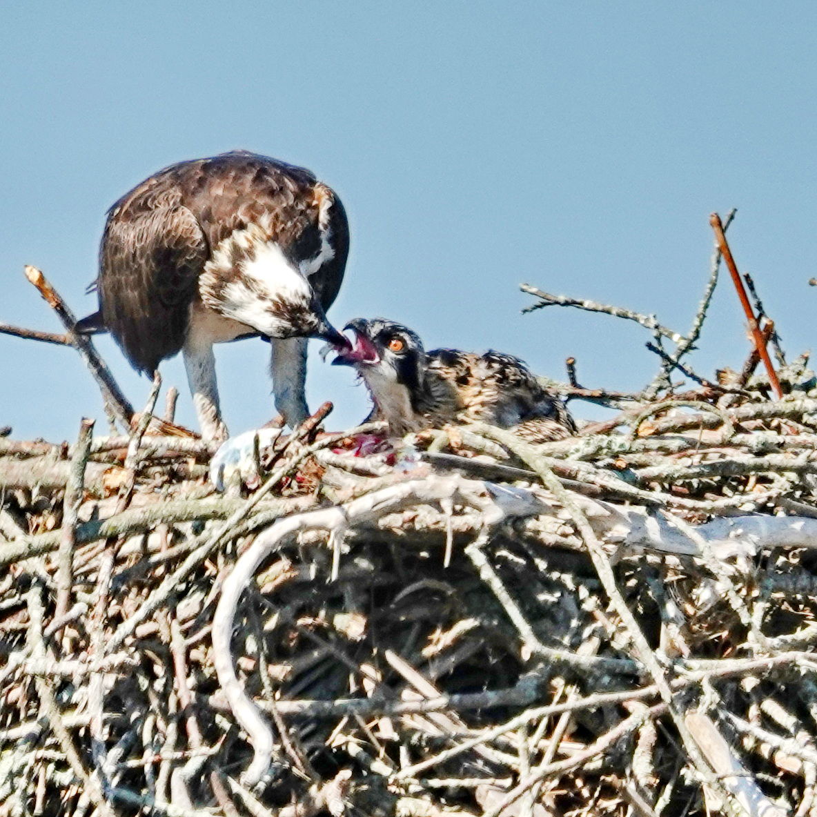 Great behavior, Jim. Allen gave some good advice. The main issue with this is the main issue with so many Osprey-on-a-nest images in that the nests are not at all photogenic and they are almost inevitably slightly out of focus if the birds are in focus. There are a few I’ve seen where the photographer managed to find a vantage point above the nest, but it’s rare to find one so situated. We have several nest platforms around here and I’ve thought many times about renting a bucket lift, but it would have to set there long enough for them to get used to it. The old-time bird photographers used to build tower blinds to photograph birds in nests like this-one even found a set of scaffolding for sale relatively cheaply and kept it handy for this kind of thing.